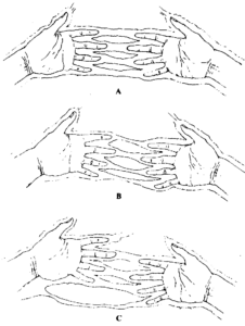 La energía se desplaza casi siempre de izquierda a derecha alrededor del círculo. Es reacia a detenerse y, por lo general, es imposible detener el flujo total. La sensación de crear algo entre las manos produce un cosquilleo acompañado de presión, algo así como la energía estática. Cuando los bordes energéticos corporales se tocan, la sensación es de hormigueo y presión. Cuando los bordes energéticos corporales tocan la piel hay una sensación de cosquilleo acompañado de presión sobre la superficie cutánea. Si traza círculos sobre la palma de la mano, puede sentir el cosquilleo por la línea el círculo. La mayoría de las personas ven una neblina alrededor de los dedos y las manos cuando tratan de detectar el aura. Parece algo así como la onda térmica sobre un radiador. En ocasiones se ve en varios colores, por ejemplo en azul. Al principio suele verse incolora. Los cuerpos energéticos se estiran como caramelo entre los dedos cuando la neblina de los de una mano conecta con la de los dedos de la mano contraria. Al desplazar las manos de forma que los dedos enfrentados sean distintos, la neblina de cada dedo seguirá inicialmente a la del anterior dedo enfrentado para saltar a continuación a la punta del más cercano estableciendo un cambio en el flujo (figura 7-14).