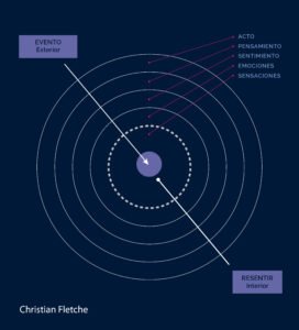 A partir de la zona de bloqueo (Pensamientos – Hacer), remontar hasta el Resentir – el lugar en el que duele, en el que hay llanto, para ponerle conciencia y movimiento (desbloqueo).