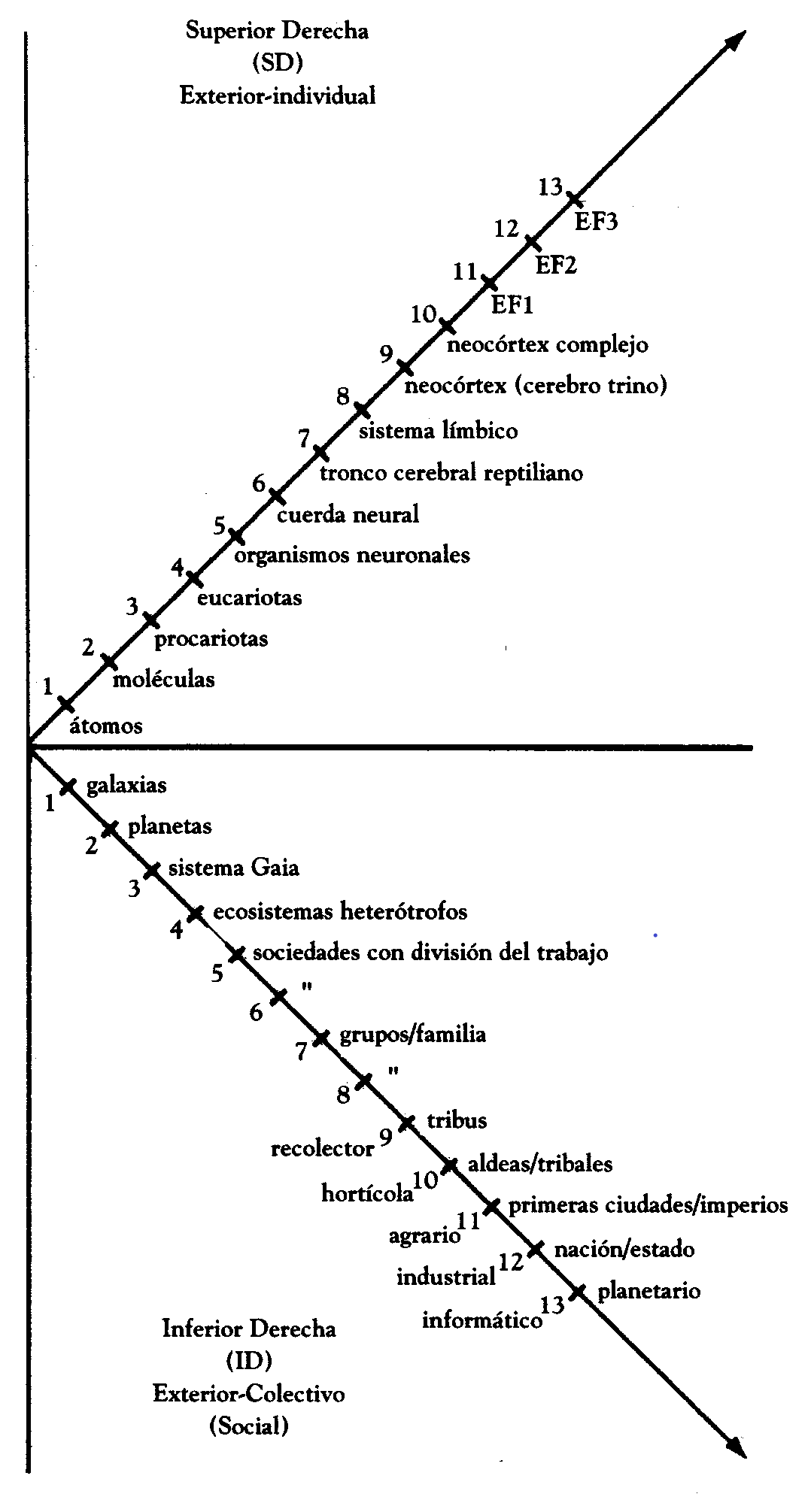 en Breve historia de todas las cosas sea la noción de los cuatro «cuadrantes» del desarrollo. El estudio de los centenares de mapas del desarrollo que han bosquejado los diversos pensadores a lo largo de los años -mapas del desarrollo biológico, del desarrollo psicológico, del desarrollo cognitivo y del desarrollo espiritual, por nombrar sólo a unos pocos – llevó a Wilber al reconocimiento de que, muy a menudo, estos mapas estaban describiendo diferentes versiones de la «verdad». Las formas exteriores del desarrollo, por ejemplo, pueden ser valoradas de manera objetiva y empírica pero, como afirma explícitamente Wilber, este tipo de verdad no lleva muy lejos. En su opinión, todo desarrollo comprehensivo también posee una dimensión interna, una dimensión subjetiva e interpretativa que está ligada a la conciencia y la introspección. Pero además, el desarrollo interno y el desarrollo externo, según Wilber, no tienen lugar aisladamente y de manera individual sino que acontecen en el seno de un contexto social y cultural. Estos son los cuatro cuadrantes de los que hablábamos.
